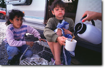 Children in the camp grow up quickly, especially girls. Poupette, right and Tania have afternoon coffee, a daily ritual, with their moms.